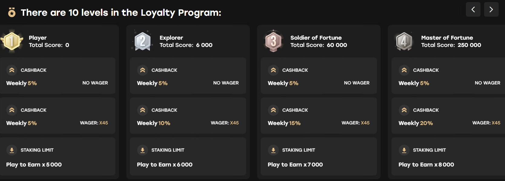 The loyalty program provides the opportunity to secure extra bonuses, free spins, and cash prizes associated with every level. Additionally, the program offers unique deals for players that help them reach even greater advantages. Below, we present the benefits of the loyalty program: